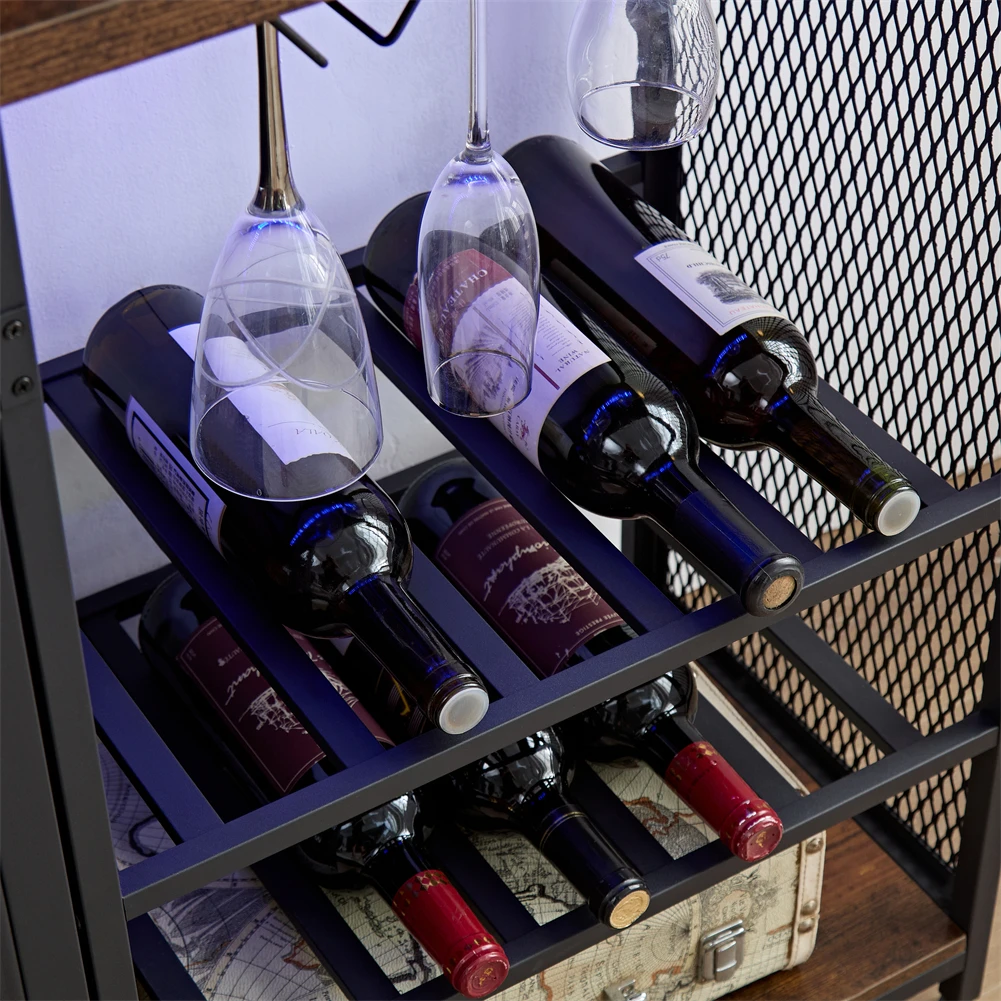 Eye-Catching LED Lighting: This cabinet comes with LED lights that create a warm atmosphere, beautifully illuminating your cups and wine bottles for an impressive display.